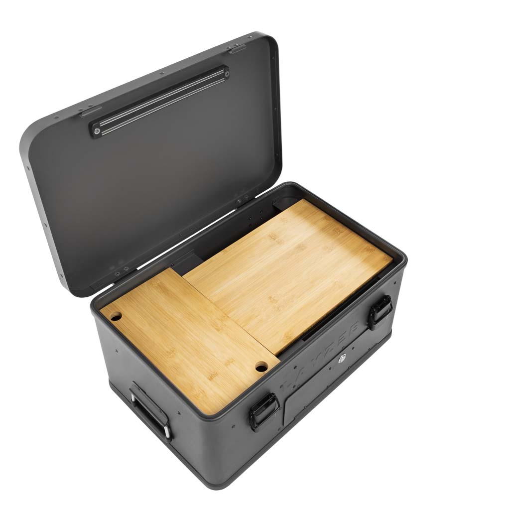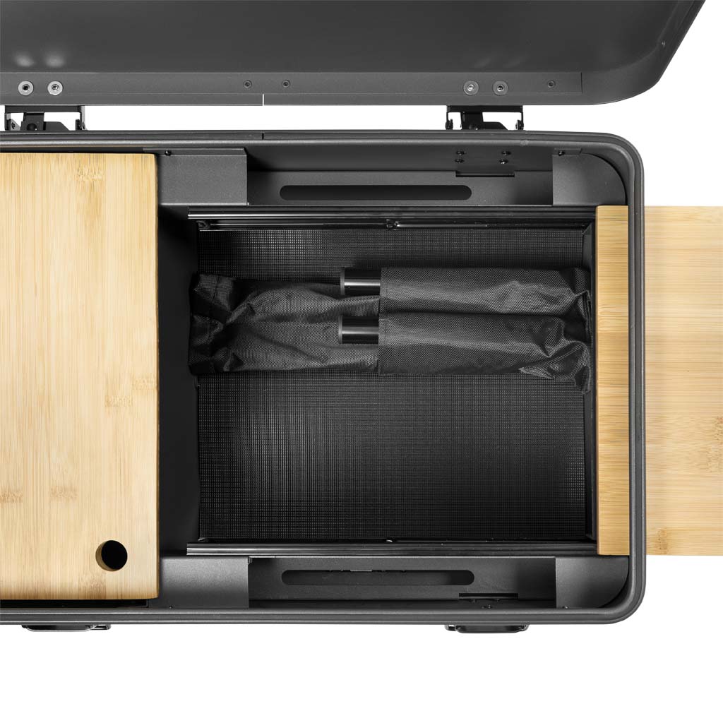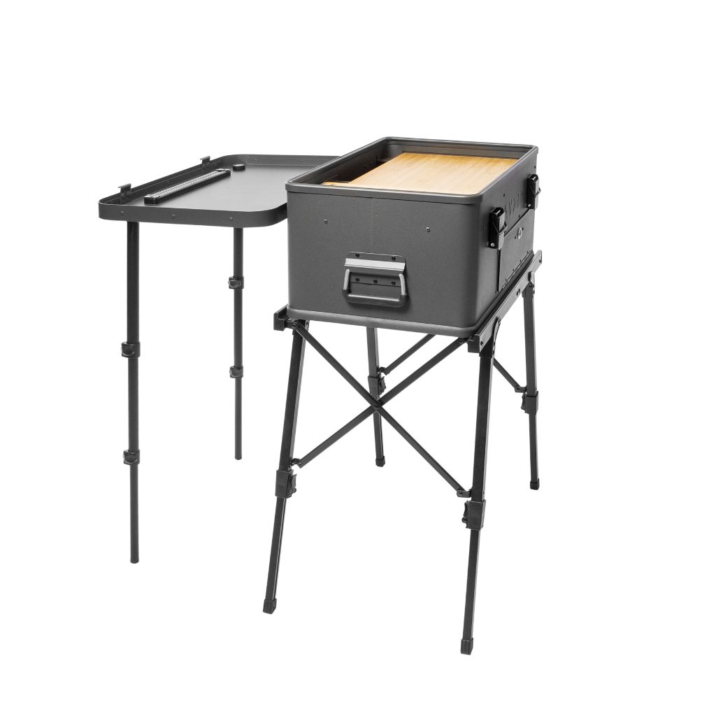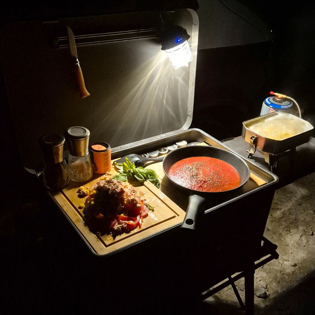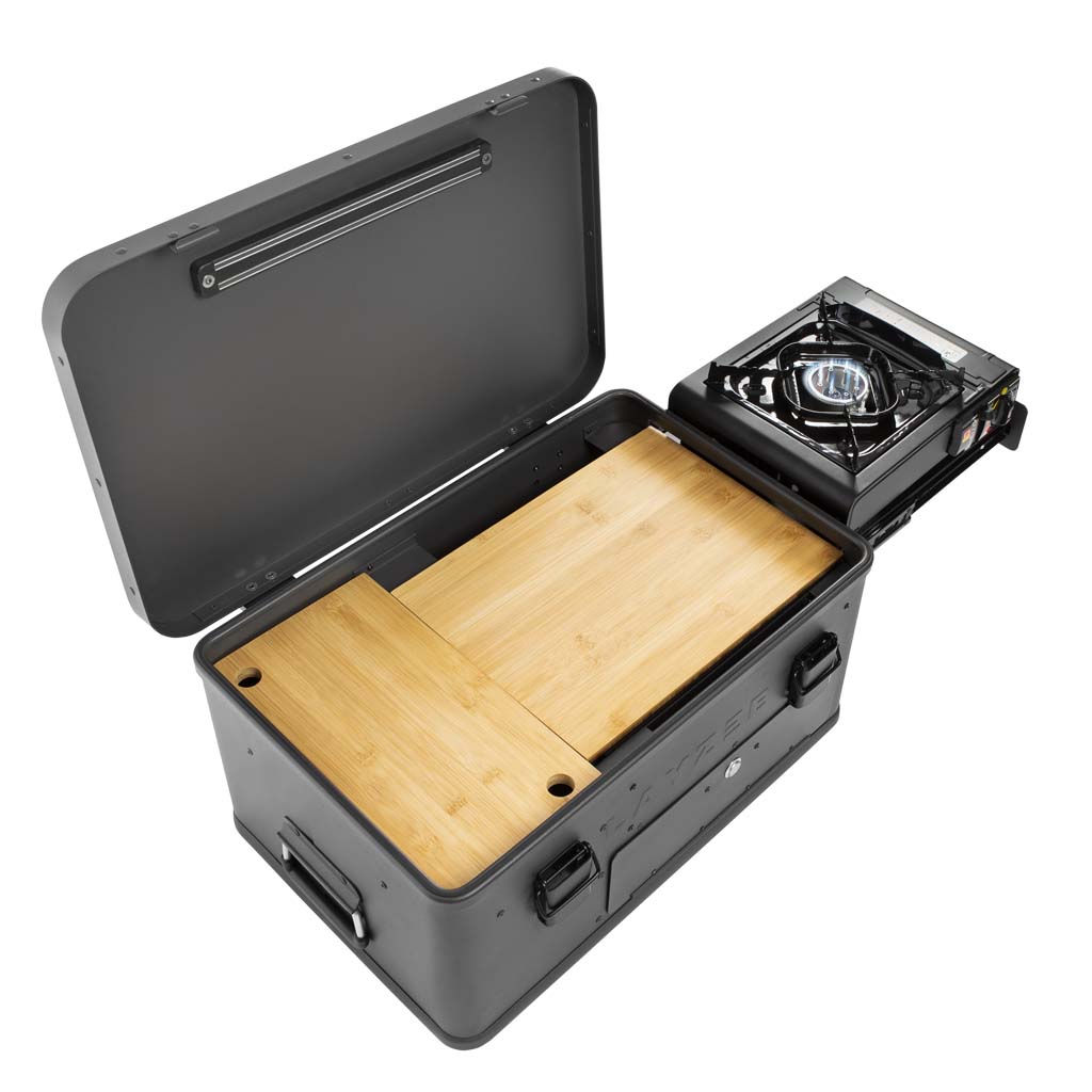 Stelle die Box außerhalb des Fahrzeugs auf. Tischbeine raus, Bambusbrett drauf – Frühstück in der Natur. Windstopper einsetzen, Deckel als Arbeitstisch nutzen – vollwertige Küche im Freien.