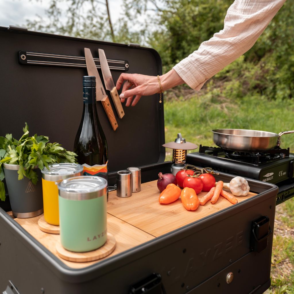 Mit passendem Zubehör wie dem Bambus-Schneidebrett, Wasserkanister, faltbarem Waschbecken und Gewürz-Set wird die LAYZEE Box zu einer vollwertigen Outdoor Küche mobil – praktisch, robust und langlebig.