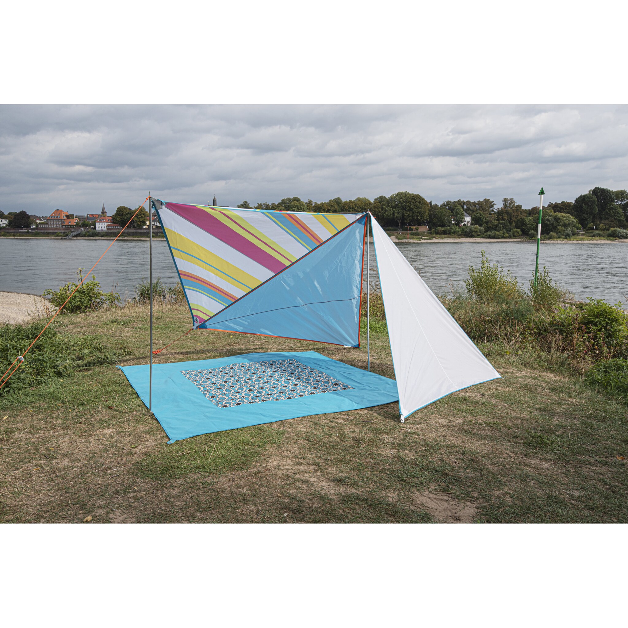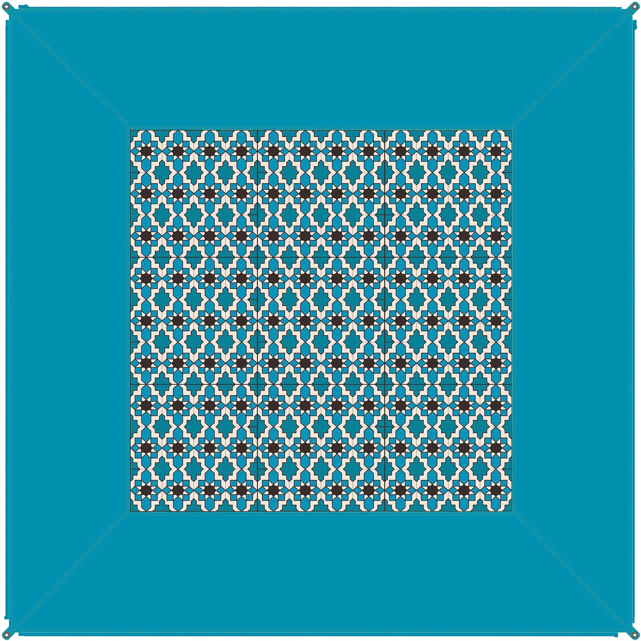 Der „Zip-Carpet Karibik“ ist im Hellblau Karibik Druck gestaltet – eine frische, freundliche Farbgebung, die sofort an Sonne, Meer und entspannte Strandtage erinnert. Der Teppich hebt sich damit optisch von klassischen Campingteppichen ab und bringt eine sommerliche Leichtigkeit in jeden Outdoor-Bereich.
