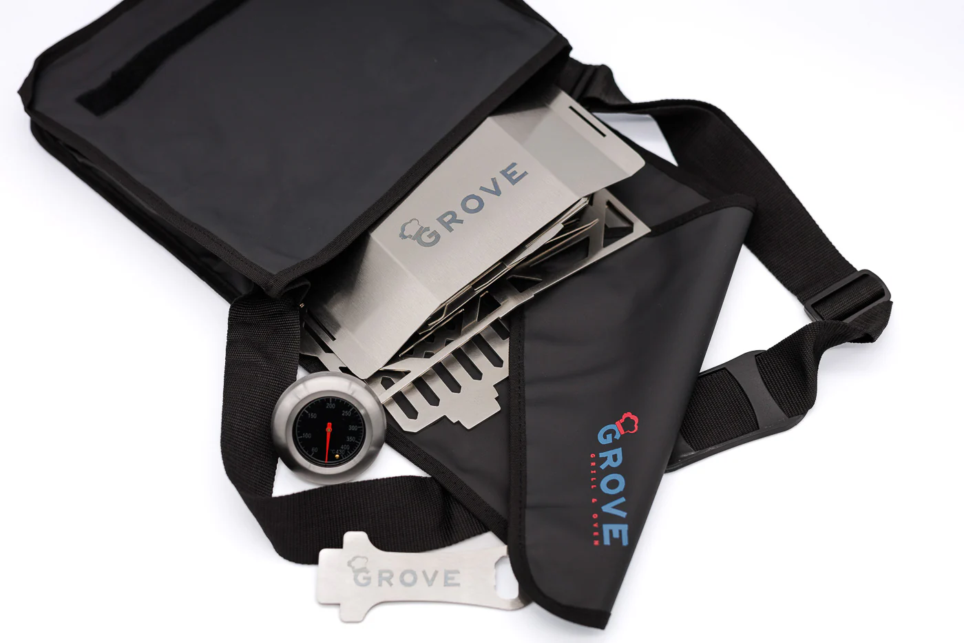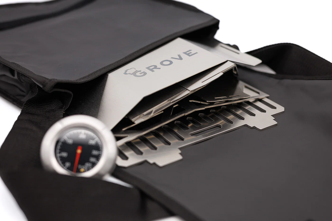 Grove denkt das Koch-Setup als System: Gasgrill-Bodenplatte, Pizzaschieber, StaySafe-Rahmen für glatte/3-Streben-Topfauflagen, Transporttasche und mehr. Alles ist darauf ausgelegt, den HORST sicherer, vielseitiger und noch praktischer zu machen.