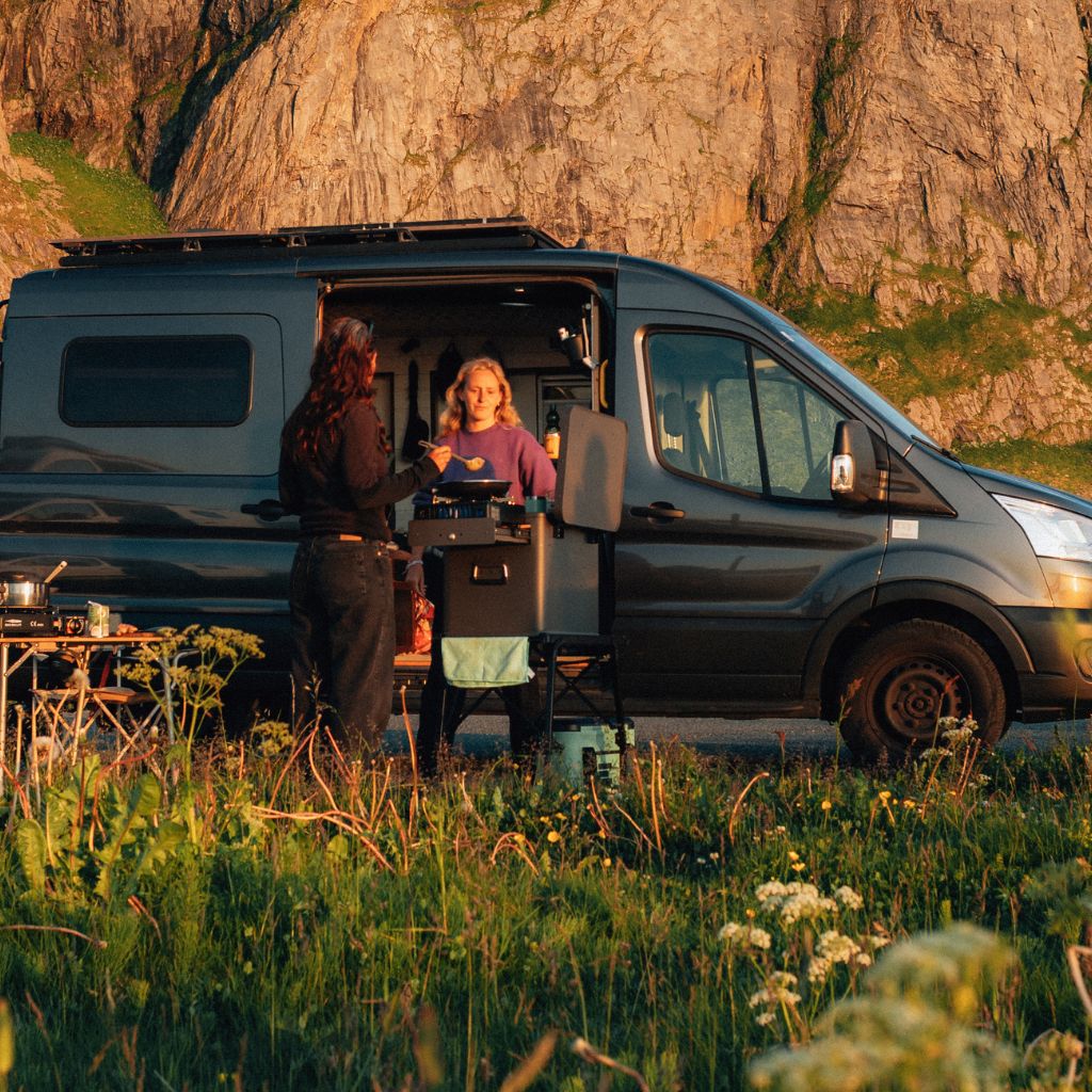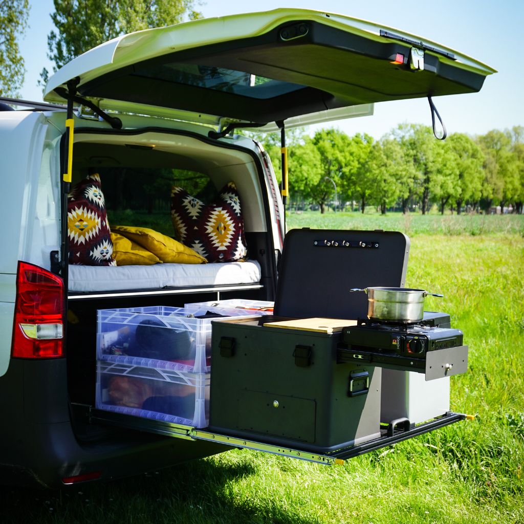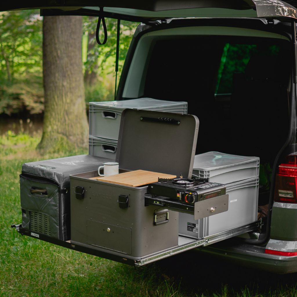 Vanlife: Im Heck deines Vans oder Fahrzeugs montiert oder einfach platziert – verwandelt sich die Box in wenigen Minuten zur Koch- und Arbeitsstation.
