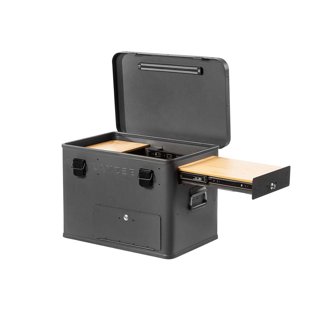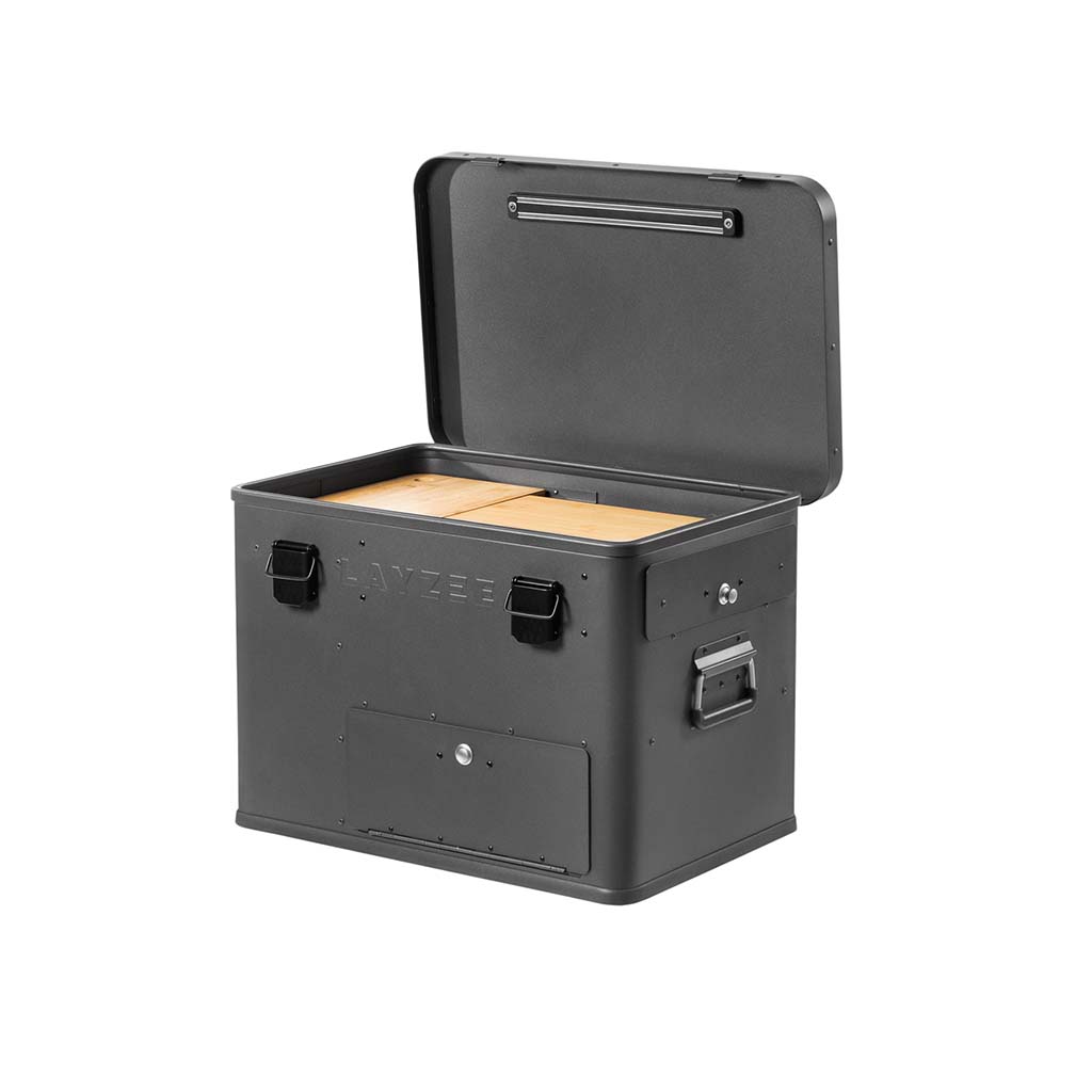 Mit passendem Zubehör wie dem Bambus-Schneidebrett, Wasserkanister, faltbarem Waschbecken und Gewürz-Set wird die LAYZEE Box zu einer vollwertigen Outdoor Küche mobil – praktisch, robust und langlebig.